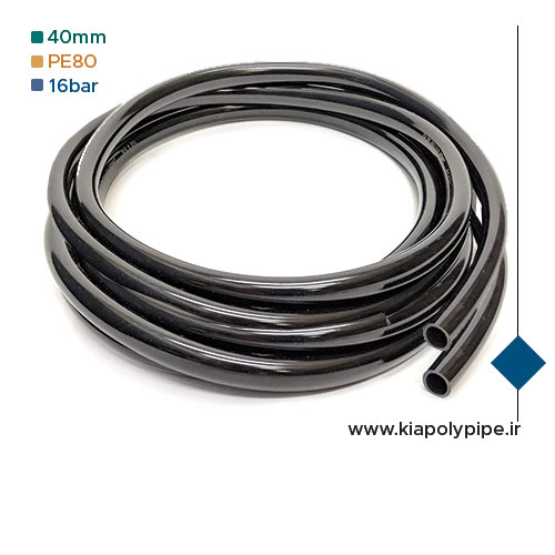 لوله ی پلی اتیلن سایز 40 میلیمتر( ¼ 1 اینچ) با گرید مواد اولیه pe80 با دانسیته بالا (HDPE) و تحمل فشار کاری 6 اتمسفر(PN) یا اصطلاحا 6 اتمسفر کوچک ترین سایز لوله های پلی اتیلن سنگین می باشد که با تحمل فشار کاری 6 اتمسفر فقط با مواد pe 80 تولید میشوند . قطر خارجی آن 40/4 میلی متر و ضخامت جداره 2 میلیمتر است که قابلیت اتصال تمامی اتصالات استاندارد مانند: